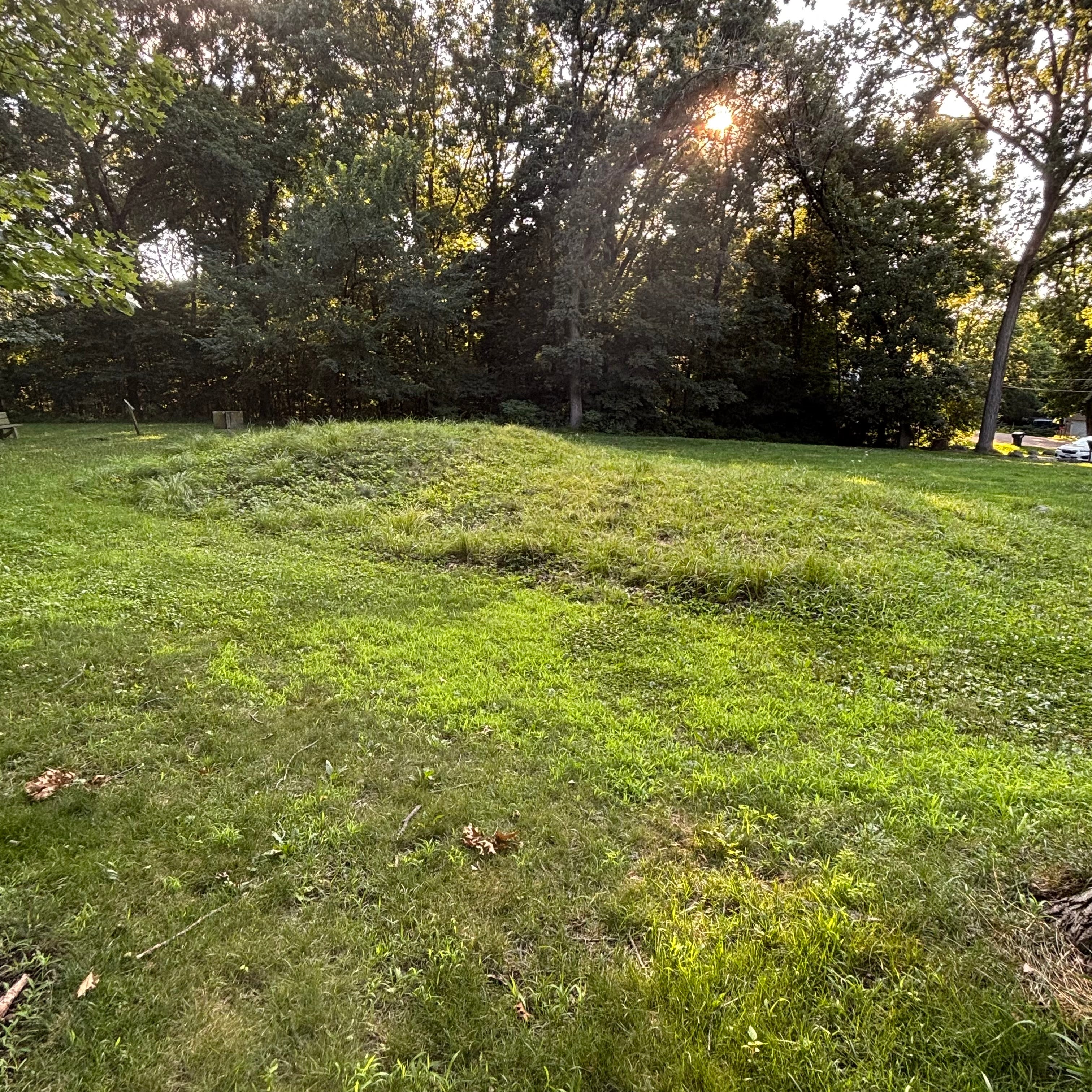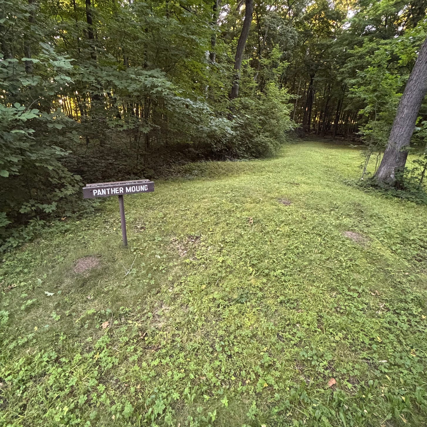 There’s a mystical feel to this site that may or may not have anything to do with the mounds themselves as works of art. These earthworks are in a thin, spacious forest, the canopy of which lets in thin beams of light that dapple the shadowed ground, giving all the sculpted bison and cougars a spectral, motile appearance, as if they’re midway through some sort of other-dimensional transit. But evidence suggests that moundbuilders kept their sites clear of much growth, so the interesting arboreal light effects are actually an imposition on the mounds by their current stewards. What isn’t an imposition is the deliberate hypertrophy of their forms, which makes them more satisfying to circumambulate. A cougar might have little nubs for legs and a head, but a tail that stretches some 100 feet or more, forcing you to experience its physical presence long after you’ve adequately conceptualized and incorporated its representational content.