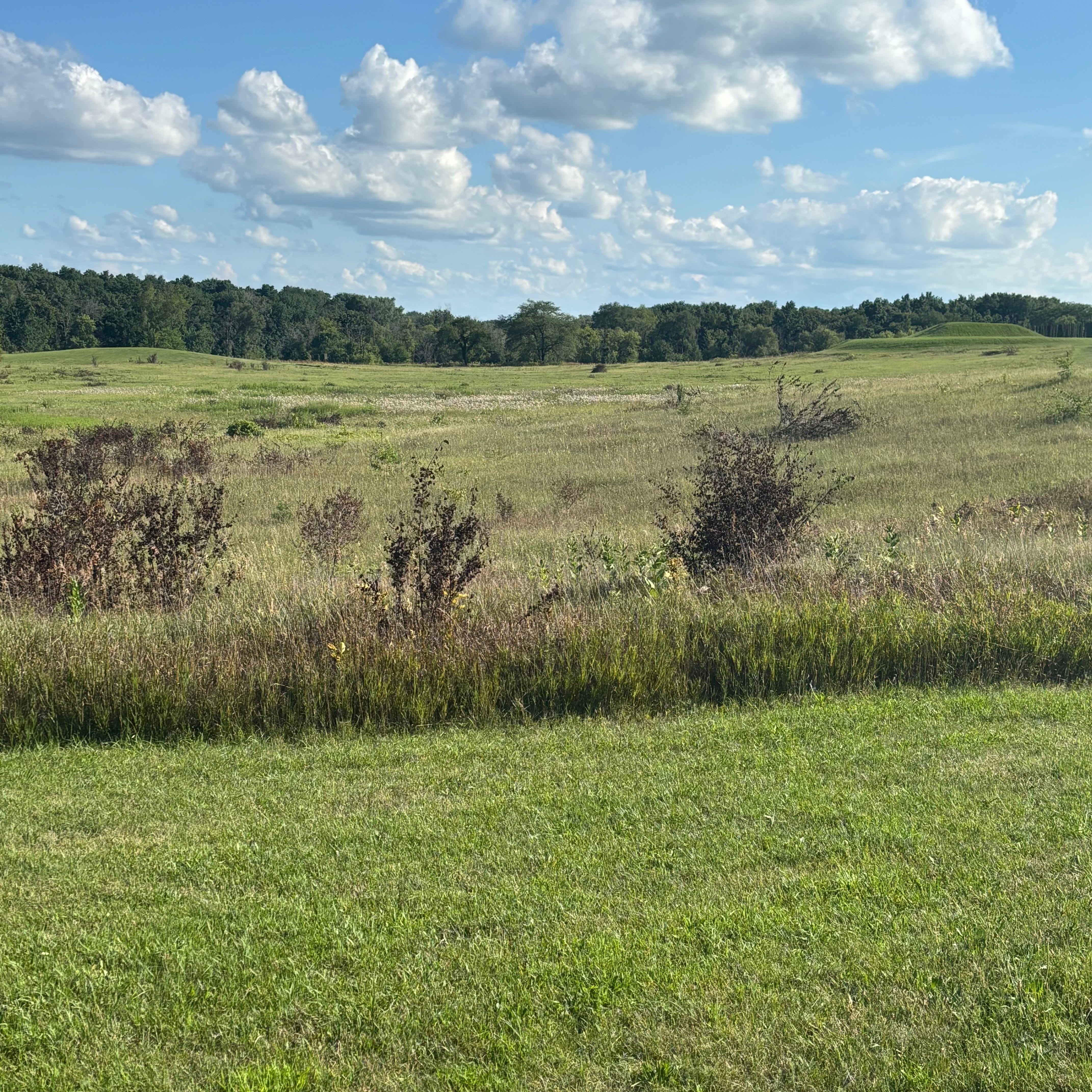 Over the years (mostly due to white settlement), this site has been reduced from some two or three hundred earthworks ringing a small lake to a crop of about a dozen on a hill up above the water. The destruction of the other hundred or two mounds, many of which were likely effigies, is a tragedy, as the remnants barely hint at what the full circumference of relief sculptures might have been like to experience some thousand years ago. What does remain, however, makes it clear that each mound, while being an enclosed sculptural form, is not a whole and discrete aesthetic unit (that is, an artwork) but rather a component of the total work which is (or would have been) the entire Koshkonong Mounds site. To speak about one’s experience of this site, then, is to deal with the impossibility of experiencing anything more substantial than a scrap of the old Woodland makers’ original intent — not just because so many of the mounds have been lost, but because it’s impossible to know whether the artists would have preferred the grass around their sculptures to be high or trimmed, the trees removed from or growing up out of their squat cougars and turtles and cones. The author of the site as it is today, then, is almost as much the landscapists of the Wisconsin State Parks system as it is the ancient people who piled up this dirt into figures. Still, the vague, ghostly presence which the existing mounds have — their selective attenuations and exaggerations of forms; the difficulty of actually seeing them in any meaningful way since they’re so big yet so low to the ground — is undeniable.