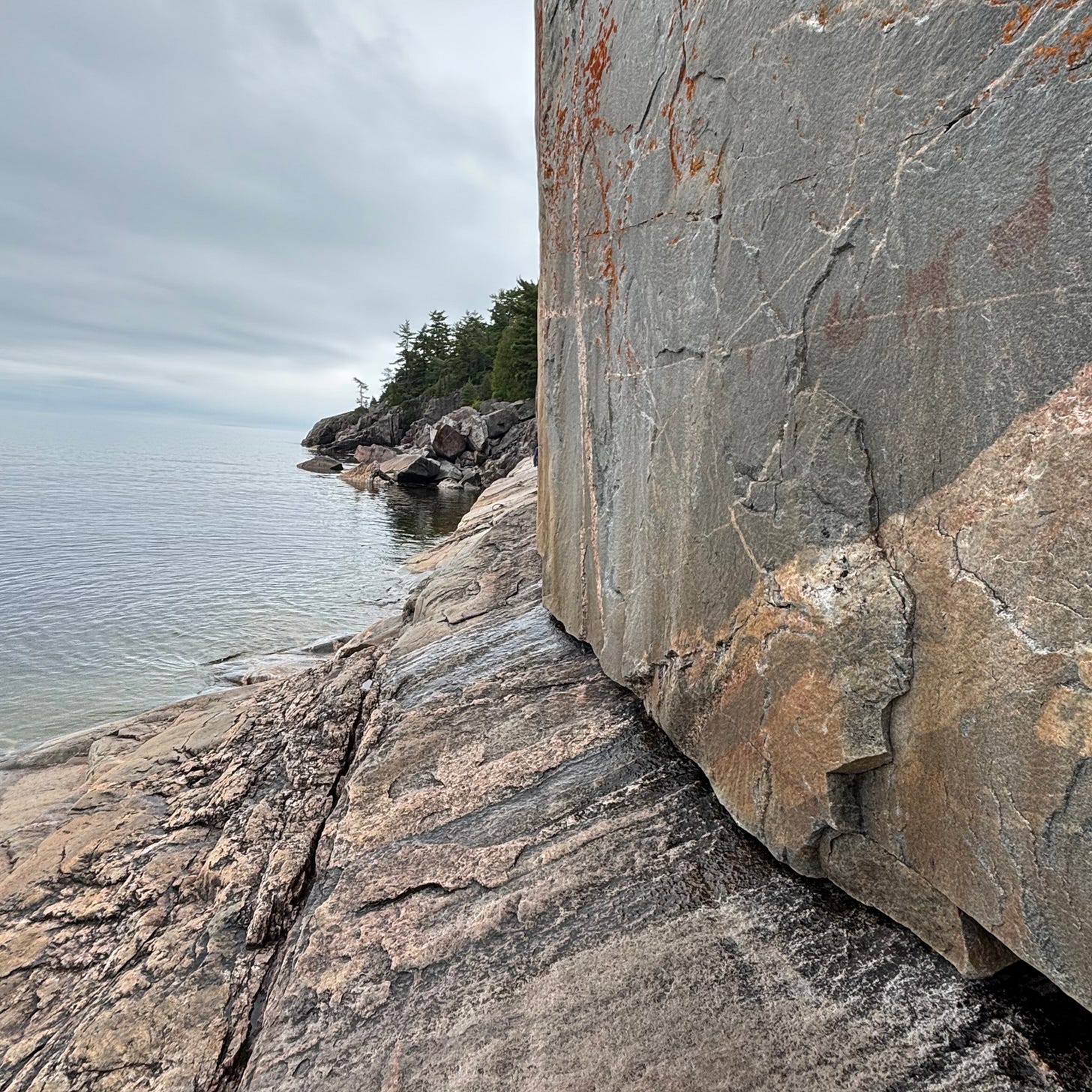 As with many North American pictograph sites, the drawings at Agawa are quite deteriorated, though you can still make out a handful of forms, notably a striking Mishpesu (mythical water lynx) figure. In its heyday the rock wall was likely a teeming palimpsest of pictures in ochre, but today it’s barely a few disconnected tableaus of limited pictorial interest. (Each figure, firmly limned, has some serious graphic power, but there are way too few of them for the amount of wall they take up; they’re swimming in space.) What remains aesthetically significant, however, is the location itself: the cliff overlooks Lake Superior, a little archipelago and an inlet to one side of the drawings and nothing but water stretching out towards the horizon on the other. The presence of the pictographs turns this vista into something picture-like itself. It becomes a component of your experience of the drawings in what ultimately seems to have been a futile attempt by the artists to bridle — to make legible or safe — the awful enormity of nature. If what survives of the Agawa Pictographs is not itself great art, they carry the residue of a gesture that is fundamentally artistic.