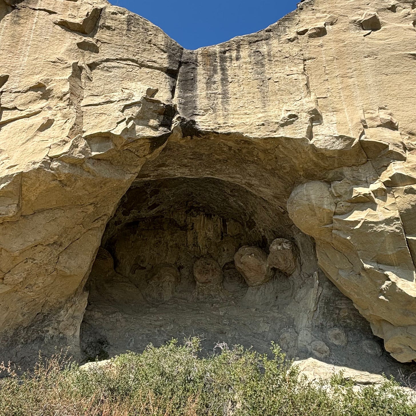It’s difficult if not impossible to appraise this site for its actual pictographs, as these are mostly, sadly, faded beyond visibility. (Something like 80% of the images that were here in the thirties, when the cave was first excavated, are now gone completely.) What can be judged — which is a crucial aspect of the actual form of any in situ artwork like this — is the site itself, which both frames and is framed by the pictures. The cave cuts into the side of a light tan cliff that sits above a dry field (opposite which are more cliffs), but it’s tucked away slightly due to the shape of the hills and is quite shrouded by vegetation (which may or may not have been present throughout the artistic life of the site). You therefore enter into the image’s field from a distinct, demarcated outside, which nevertheless remains open and potentially visible at your back. The elevation of the caves is insubstantial but aesthetically significant: situated just above an expanse that’s below them, the pictures invite broad speculation of the world beyond, yet refuse completely to be of this world. The site therefore makes the pictographs seem to be both inside and outside of reality; such liminality is something like a prerequisite for the aesthetic success of any image. However, we’re left to conjecture about (and certainly not to experience) any particular formal relationships between this artwork and where it’s located, as the images themselves are destroyed.